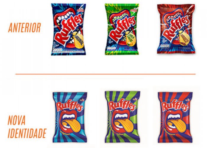 No dia 27/09, a Ruffles divulgou sua nova identidade visual. As embalagens, conhecidas por sua mistura de cores, traços, base no azul e boca característica, agora adotam um acabamento fosco e um layout menos poluído. Além da nova – e questionada – boca ter ganho mais destaque, inspirado nas tendências pop e geek.
